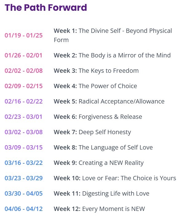 Each week you will recieve an email with a video, a reading, and an exercise to practice during the week.